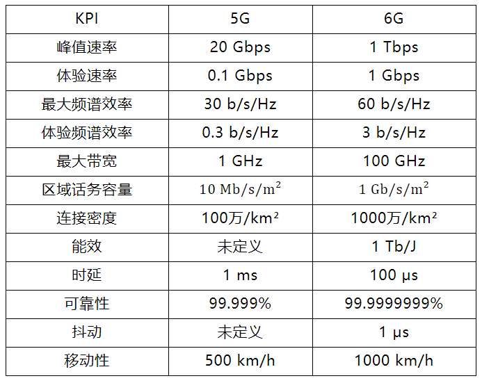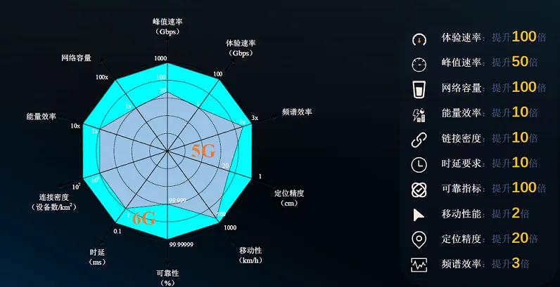 5G作为4G的延伸,也具有明显的高速率,低时延、大容量等特征,例如:传输速度可达20Gbps;时延低至1ms;5G室内定位精度3.5GHz频段下在5m左右,毫米波定位精度可以达到3m……但6G与之相较,优势更为突出。